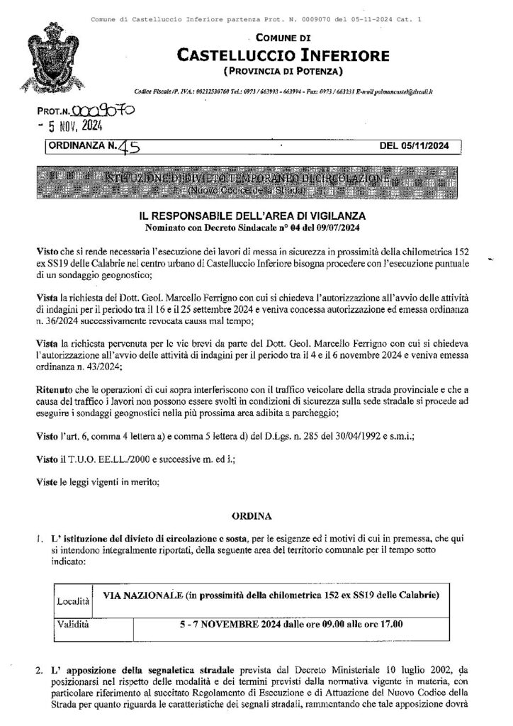 Il Comune di Castelluccio Inferiore ha emesso un’ordinanza che impone un divieto temporaneo di circolazione e sosta su un tratto della Via Nazionale, nei pressi del chilometro 152 lungo la ex SS19 delle Calabrie. Questa misura, in vigore dal 5 al 7 novembre 2024, si applicherà dalle ore 09:00 alle 17:00 e ha l’obiettivo di garantire la sicurezza e l’ordine nella zona durante un periodo critico.